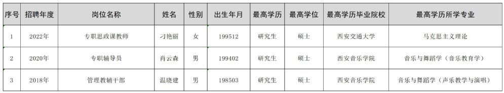 根据陕西省教育厅相关通知,结合我校今年空编情况,经学校会议研究,本年度给予学工部专职辅导员入编计划数1个,马克思主义学院专职思政课教师入编计划数1个,管理教辅干部拟入编计划数1个。综合考量入职年限、工作表现及履职情况,经部门、院系考核推荐,学校审核,拟安排以下3名人事代理人员入编,现将名单公示如下: